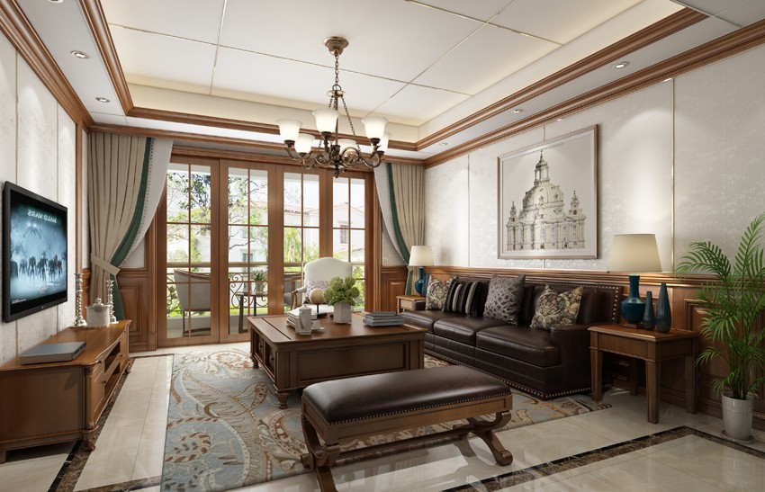 欧式休闲风格是对传统的简化,深色系实木家具与深蓝色窗帘表现空间的沉稳,线条搭配吊顶与地面波打线的装饰更能表达欧式风格的奢华与强烈的动感,米黄色护墙板与家具上金色的装饰配件与欧式风格相映。 四. 中式客厅装修效果