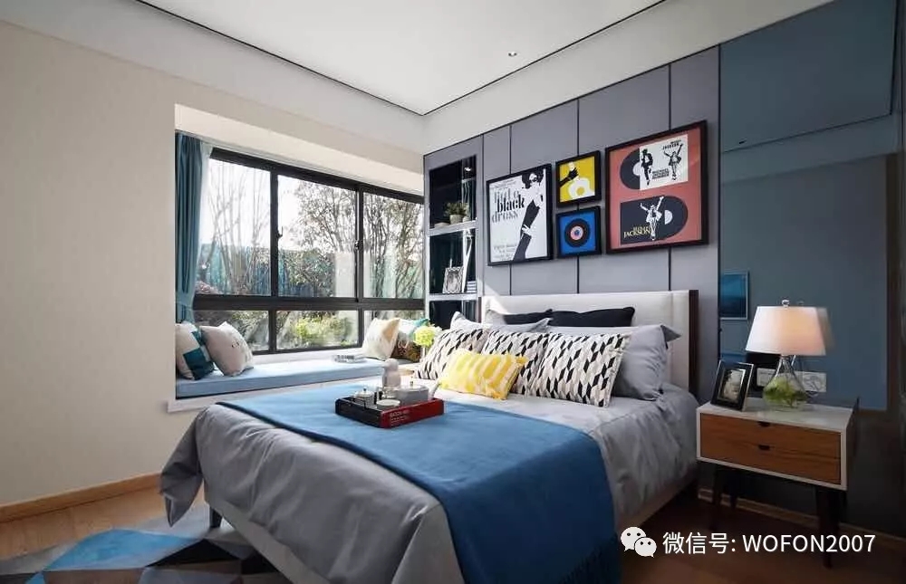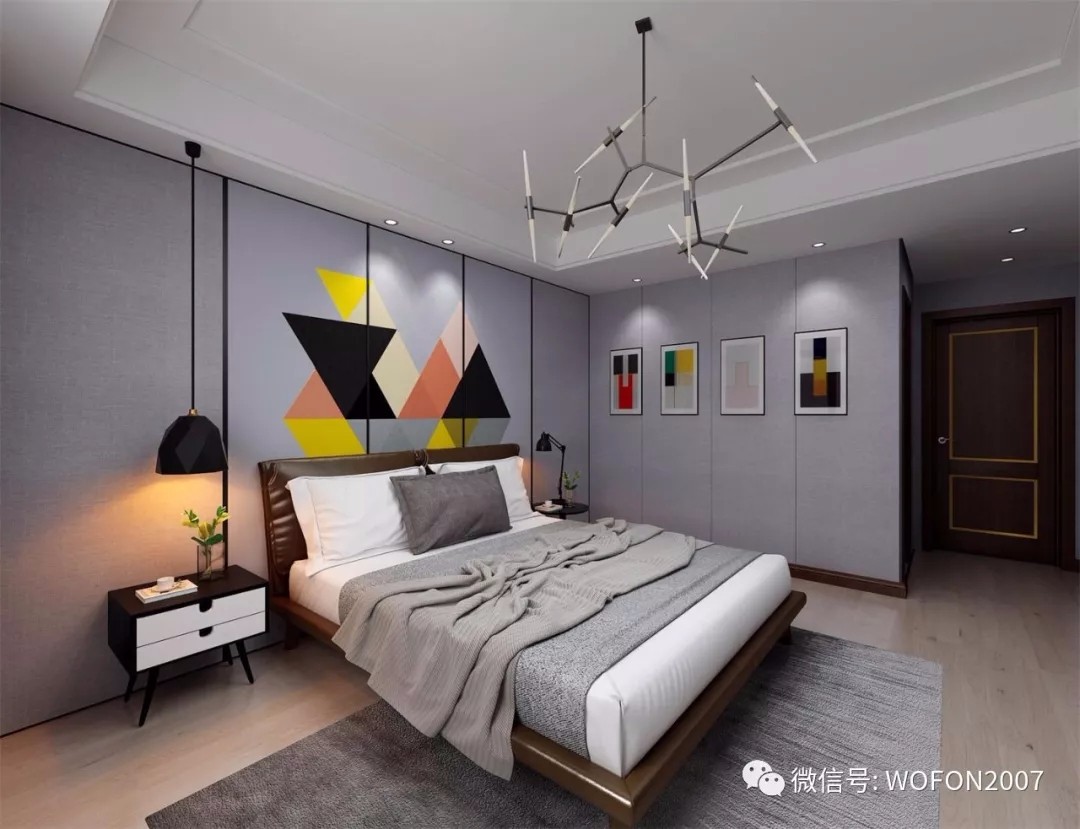 如果说客厅电视背景墙是个人审美的体现,那卧室背景墙则可以透露情趣。兔菇凉觉得,在卧室背景墙上挂结婚照什么的,实在是太out了。那如何将时尚元素和背景墙结合呢?看看下面的效果图就够了。