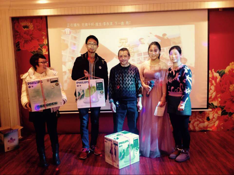 精致可口的菜肴,精彩绝伦的表演,激动人心的抽奖,将晚宴的气氛推向一波又一波的高潮,公司员工带来激情澎湃的诗朗诵“勇气”、小游戏“蒙眼吃香蕉”、歌曲演唱“雪绒花”、“小夜曲”等精彩的节目。董事长一曲“水手”带动全场,一波又一波的抽奖活动牵动着每个人的小心脏,丰富的奖品照应着一张张灿烂的笑脸。年轻的脸庞,充满着年轻的活力,犹如武峰吊顶一般,像旭日般升起。